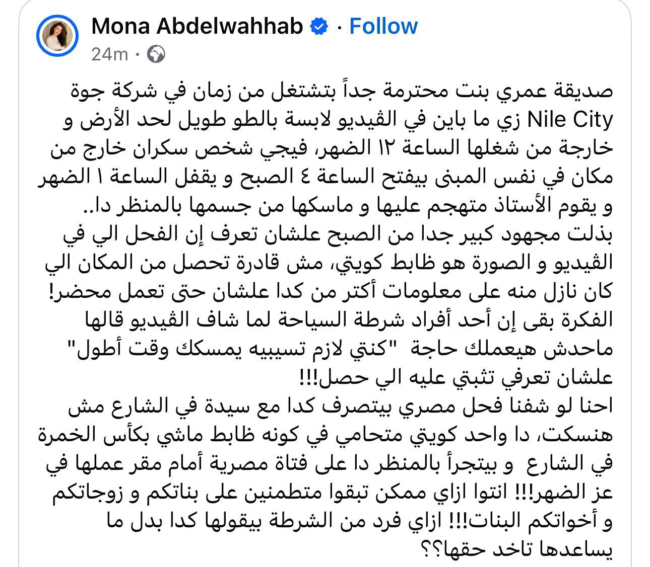 وتكمل: "احنا لو شفنا فحل مصري بيتصرف كدا مع سيدة في الشارع مش هنسكت، دا واحد كويتي متحامي في كونه ضابط ماشي بكأس الخمرة في الشارع ويتجرأ بالمنظر دا على فتاة مصرية أمام مقر عملها في عز الضهر!!! انتوا ازاي ممكن تبقوا مطمنين على بناتكم و زوجاتكم و أخواتكم البنات!!! ازاي فرد من الشرطة بيقولها كدا بدل ما يساعدها تاخد حقها؟؟".