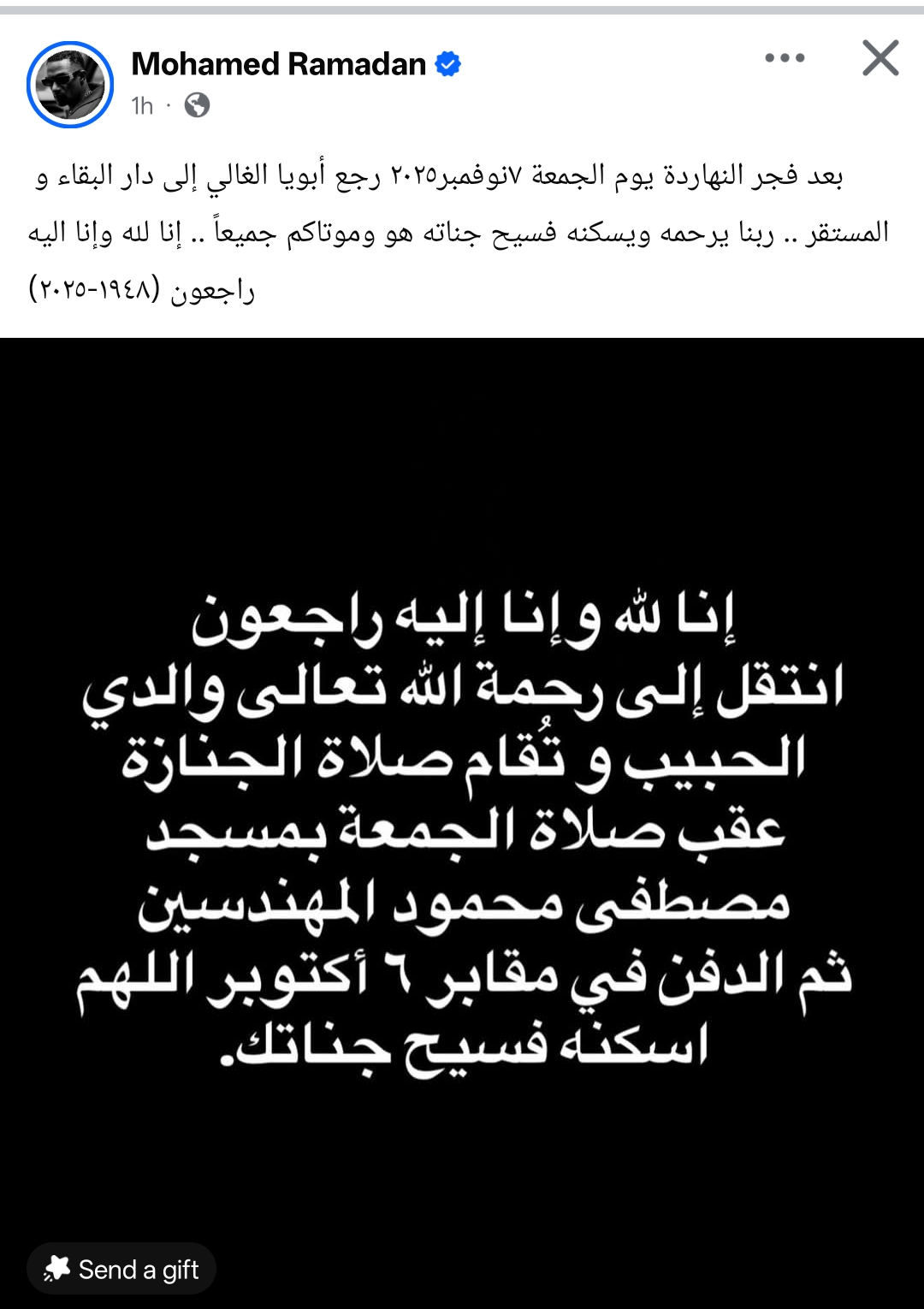 وكتب محمد رمضان من خلال حسابه الرسمي عبر موقع التواصل الاجتماعي فيسبوك: بعد فجر النهاردة يوم الجمعة ٧ نوفمبر ۲۰۲٥ رجع أبويا الغالي إلى دار البقاء و المستقر .. ربنا يرحمه ويسكنه فسيح جناته هو وموتاكم جميعاً .. إنا لله وإنا اليه راجعون (١٩٤٨-٢٠٢٥).