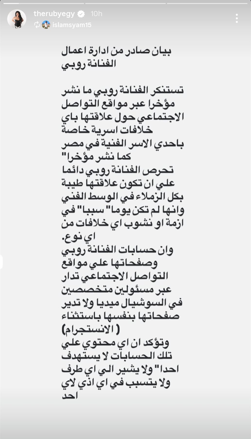 أصدر إسلام صيام، مدير أعمال الفنانة روبي، بيانًا رسميًا نشر عبر خاصية "ستوري" على الحساب الرسمي لها بموقع التواصل الاجتماعي إنستجرام، استنكر خلاله الزج باسمها في خلافات أسرية تخص إحدى العائلات الفنية الشهيرة.