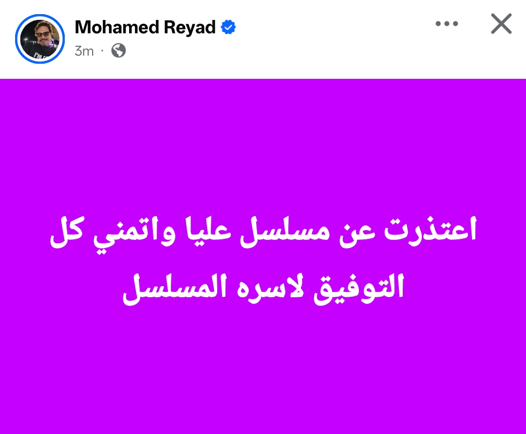 وكتب محمد رياض من خلال حسابه الرسمي عبر موقع التواصل الاجتماعي فيسبوك، قال: اعتذرت عن مسلسل عليا واتمنى كل التوفيق لـ أسرة المسلسل.
