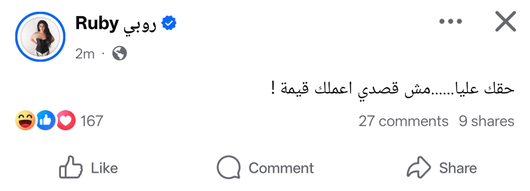 وكتبت “روبي” من خلال حسابها الرسمي عبر موقع التواصل الاجتماعي فيسبوك، قائلًا: "حقك عليا.. مش قصدي اعملك قيمة".