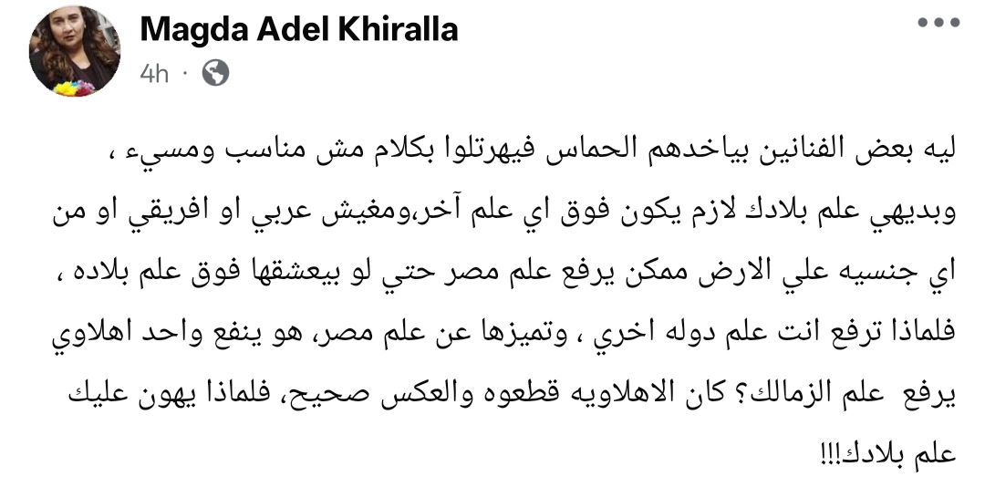 وكتبت ماجدة خير الله من خلال حسابها الرسمي عبر موقع التواصل الاجتماعي فيسبوك، قالت: ليه بعض الفنانين بياخدهم الحماس فيهرتلوا بكلام مش مناسب ومسيء ، وبديهي علم بلادك لازم يكون فوق اي علم آخر، ومغيش عربي او افريقي او من اي جنسيه علي الارض ممكن يرفع علم مصر حتي لو بيعشقها فوق علم بلاده ، فلماذا ترفع انت علم دوله اخري ، وتميزها عن علم مصر، هو ينفع واحد اهلاوي يرفع علم الزمالك؟ كان الاهلاويه قطعوه والعكس صحيح، فلماذا يهون عليك علم بلادك!!!.