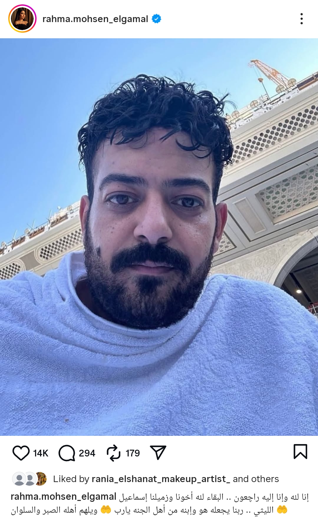 وكتبت رحمة محسن من خلال حسابها الرسمي عبر موقع تبادل الصور والفيديوهات القصيرة إنستجرام، قال: إنا لله وإنا إليه راجعون .. البقاء لله أخونا وزميلنا إسماعيل الليثي .. ربنا يجعله هو وإبنه من أهل الجنه يارب ويلهم أهله الصبر والسلوان.