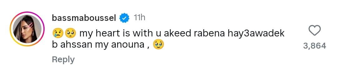 وعلقت بسمة بوسيل على منشور آن الرفاعي، الذي أعلنت من خلاله الطلاق، وذلك من خلال حسابها الرسمي عبر موقع تبادل الصور والفيديوهات القصيرة إنستجرام، وكتبت بسمة بوسيل: قلبي معاكي وأكيد ربنا هيعوضك بالأحسن يا آنونة.