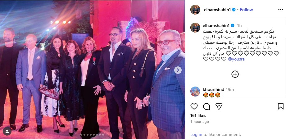 ونشرت إلهام شاهين صور تجمعهما سويًا أثناء التكريم، وذلك من خلال حسابها الرسمي عبر موقع تبادل الصور والفيديوهات القصيرة إنستجرام، ووجهت لها رسالة، حيث قالت: تكريم مستحق لنجمه مصريه كبيرة حققت نجاحات فى كل المجالات سينما و تلفزيون و مسرح.. تاريخ مشرف.. ربنا يوفقك حبيبتي.. دايما مشرفه لإسم الفن المصرى.. بحبك من كل قلبي.