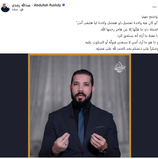 وفي أول تعليق منه على هذه الأزمة، كتب عبد الله رشدي من خلال حسابه الرسمي عبر موقع التواصل الاجتماعي فيسبوك، قال: توضيح مهم:"لو كان فيه واحدة تفصيل..لو هفصل واحدة ليا هتبقى أنتِ".. الجملة دي ما قلتُها إلا عن هاجر رحمها الله.