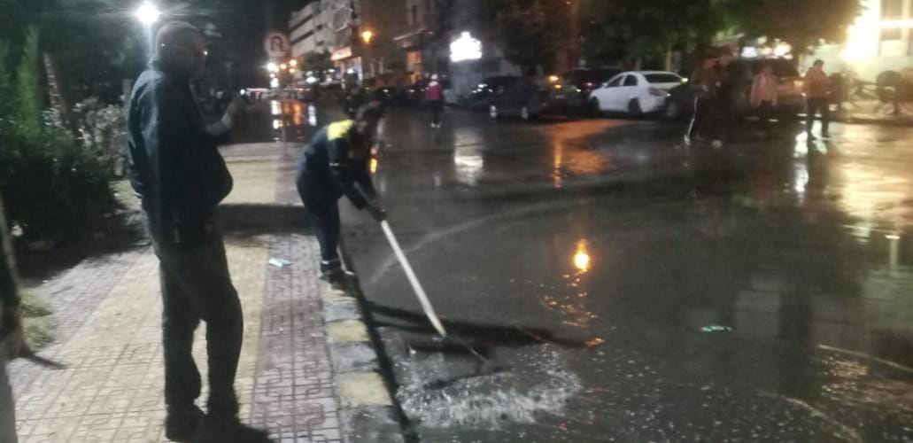 حيث تم الدفع بأكثر من 1500 عامل خلال الوردية الليلية للمعاونه في كسح مياه الأمطار إلي جانب أعمالهم الأساسية و كذلك توفير عدد من تنكات المياه للمعاونه في أعمال شفط و كسح المياه