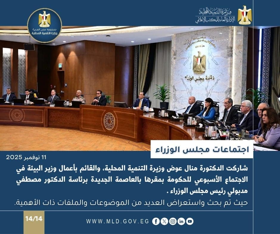 كما شاركت الدكتورة منال عوض وزيرة التنمية المحلية والقائم بأعمال وزير البيئة، في الاجتماع الأسبوعي للحكومة، وذلك بمقرها بالعاصمة الجديدة، برئاسة الدكتور مصطفى مدبولي، رئيس مجلس الوزراء؛ حيث تم بحث واستعراض العديد من الموضوعات والملفات ذات الأهمية.