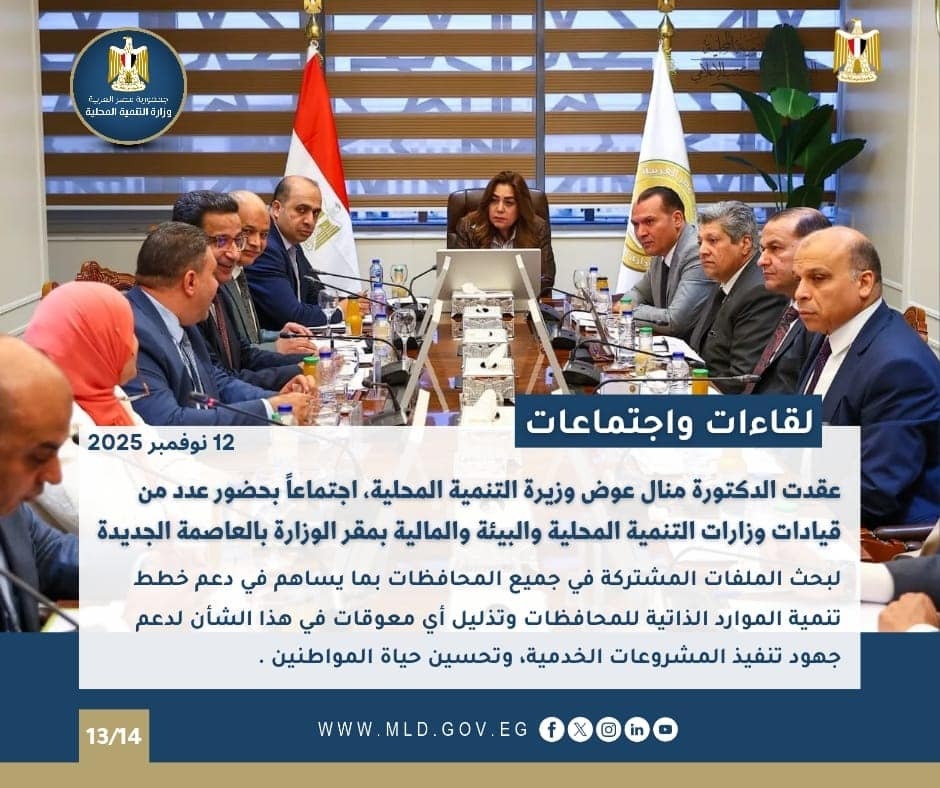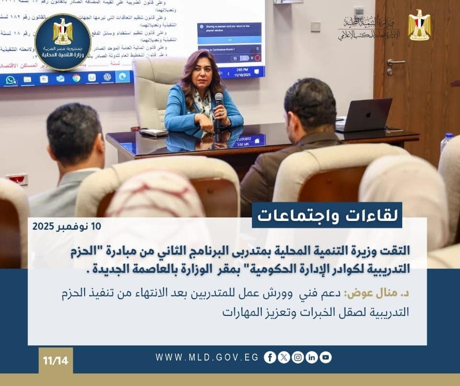 كما أعلنت الدكتورة منال عوض وزيرة التنمية المحلية والقائم بأعمال وزير البيئة، عن انطلاق البرنامج التدريبي الثاني من مبادرة "الحزم التدريبية لكوادر الإدارة الحكومية"، والذي يعقد خلال الفترة من 9 إلى 11 نوفمبر 2025 بمقر الوزارة بالعاصمة الجديدة، بحضور عدد من قيادات وزارة التنمية المحلية ومركز التنمية المحلية للتدريب بسقارة وذلك تحت عنوان "آليات الحوكمة وأفضل الممارسات في إعداد اللوائح المالية والإدارية" .