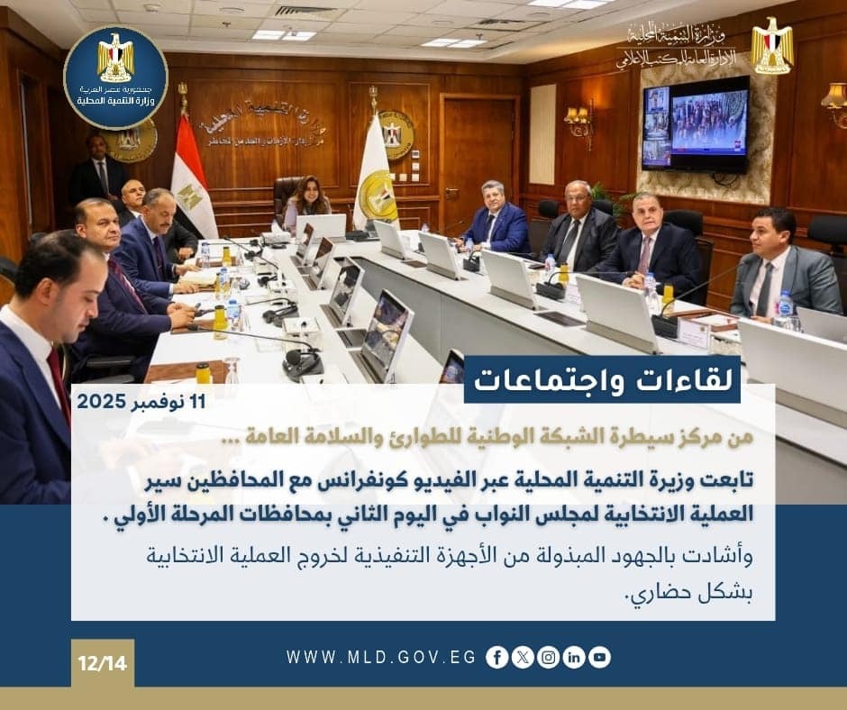 تلقت الدكتورة منال عوض وزيرة التنمية المحلية والقائم بأعمال وزير البيئة، تقريرًا من غرفة العمليات المركزية بالوزارة حول سير فعاليات اليوم الثاني لانتخابات مجلس النواب 2025 بمحافظات المرحلة الأولى، والتي تتابع الوزارة تنفيذها بالتنسيق مع غرف العمليات في جميع المحافظات، ومركز السيطرة الرئيسي للشبكة الوطنية للطوارئ والسلامة العامة.