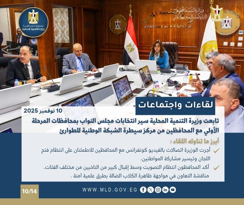 تابعت الدكتورة منال عوض وزيرة التنمية المحلية والقائم بأعمال وزير البيئة اليوم ، سير العملية الانتخابية فى اليوم الأول لانتخابات مجلس النواب 2025 بمحافظات المرحلة الأولي وتشمل 14 محافظة هي: الجيزة – الفيوم – الوادي الجديد – بنى سويف – المنيا – أسيوط – سوهاج – قنا – الأقصر – أسوان – البحر الأحمر- الإسكندرية – البحيرة – مطروح) ، وذلك عبر مركز السيطرة الموحد للشبكة الوطنية للطوارئ والسلامة العامة بالديوان العام للوزارة بالعاصمة الجديدة.