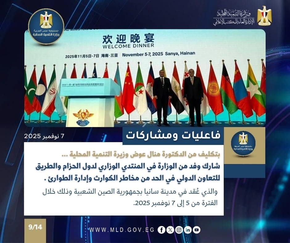 بتكليف من الدكتورة منال عوض وزيرة التنمية المحلية، شارك وفد رفيع المستوى من للوزارة في المنتدي الوزاري لدول الحزام والطريق للتعاون الدولي في الحد من مخاطر الكوارث وإدارة الطوارئ والذي عُقد في مدينة سانيا بجمهورية الصين الشعبية وذلك من 5 إلى 7 نوفمبر 2025.