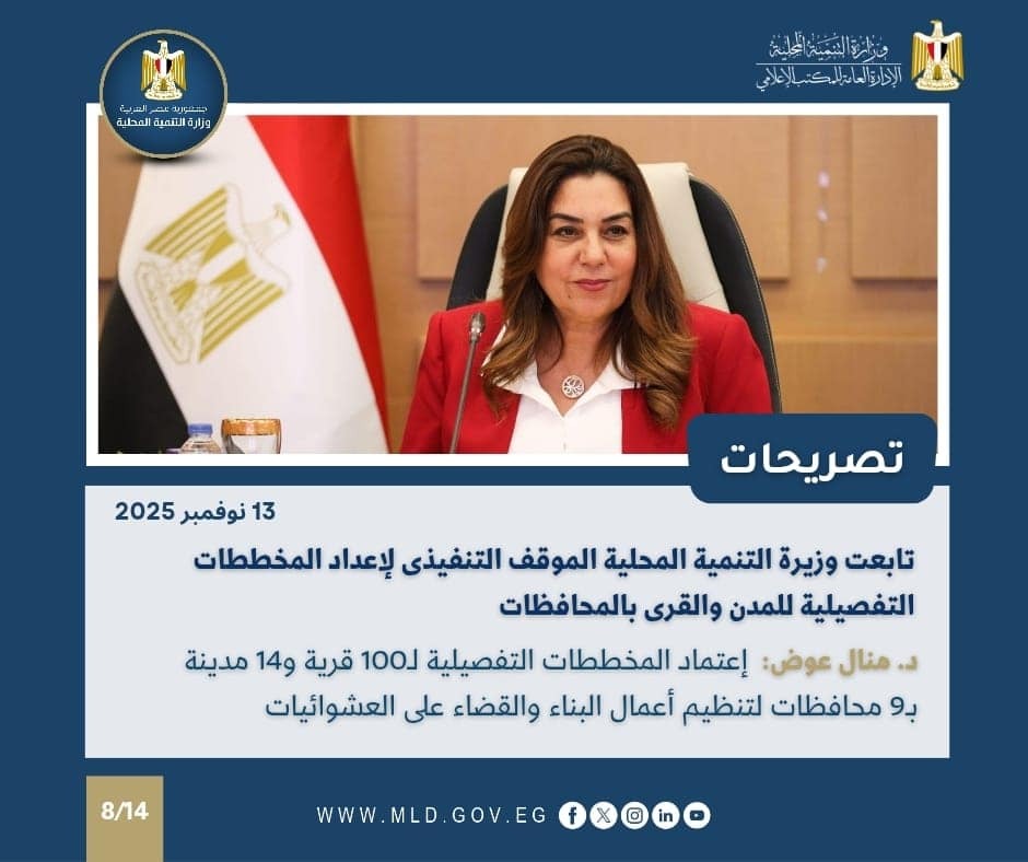 كما تلقت الدكتورة منال عوض وزيرة التنمية المحلية، تقريراً حول الموقف التنفيذي لإعداد المخططات التفصيلية للمدن والقرى بالمحافظات خلال العام المالى الحالى ٢٠٢٥/ ٢٠٢٦ والتى تم إعدادها من خلال بروتوكول التعاون المشترك المبرم بين وزارة التنمية المحلية والهيئة الهندسية للقوات المسلحة لتنفيذ رؤية الدولة فى تنظيم أعمال البناء والقضاء على العشوائيات وضمان الإلتزام بالاشتراطات البنائية والتخطيطية وفقًا للقانون رقم 119 لسنة 2008.