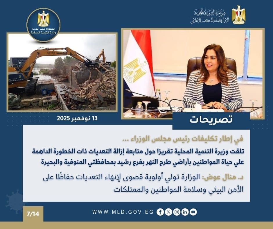 وتلقت الدكتورة منال عوض وزيرة التنمية المحلية والقائم بأعمال وزيرة البيئة، تقريرًا مفصلًا من رئيس قطاع الإدارة الاستراتيجية والتنمية المحلية بالوزارة، حول الموقف التنفيذي لأعمال إزالة التعديات على أراضي طرح النهر داخل القطاع المائي لمجرى نهر النيل وفرعيه، وخاصة فرع رشيد بمحافظتي المنوفية والبحيرة، وذلك تنفيذًا لتكليف رئيس مجلس الوزراء خلال اجتماع مجلس المحافظين رقم (60) لإزالة التعديات علي طرح النهر .
