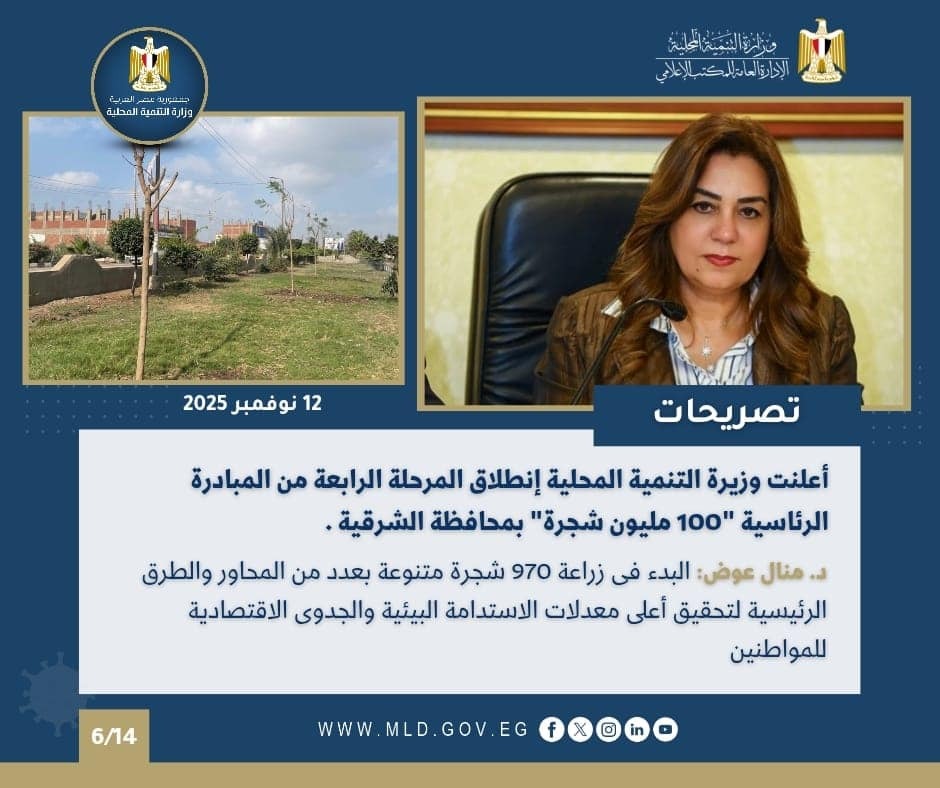 كما تلقت الدكتورة منال عوض وزيرة التنمية المحلية والقائم بأعمال وزيرة البيئة، تقريرًا اليوم حول الموقف التنفيذي للمرحلة الرابعة من المبادرة الرئاسية "100 مليون شجرة"، والتي تم إطلاقها بمحافظة الشرقية بهدف تعزيز الغطاء النباتي وتحسين جودة الهواء ودعم جهود الدولة للتحول نحو الاستدامة البيئية.