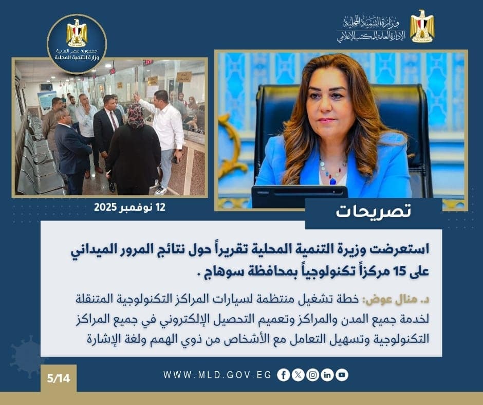 واستعرضت الدكتورة منال عوض وزيرة التنمية المحلية تقريراً حول نتائج المرور الميداني الذي نفذته فرق الوزارة من الإدارة العامة للمراجعة الداخلية والحوكمة على عدد 15 مركزاً تكنولوجياً بعدد من المراكز والمدن بمحافظة سوهاج خلال شهر أكتوبر 2025 وذلك فى (الديوان العام -سوهاج - حي غرب سوهاج - حي شرق سوهاج - المنشأة - دار السلام - الفردوس - أخميم - طهطا - طما - المراغة - ساقلته - جهينة - جرجا) لمتابعة مستوى الخدمات المقدمة للمواطنين وقياس مدى رضاهم عنها، والوقوف على معدلات الأداء في الملفات الخدمية اليومية.