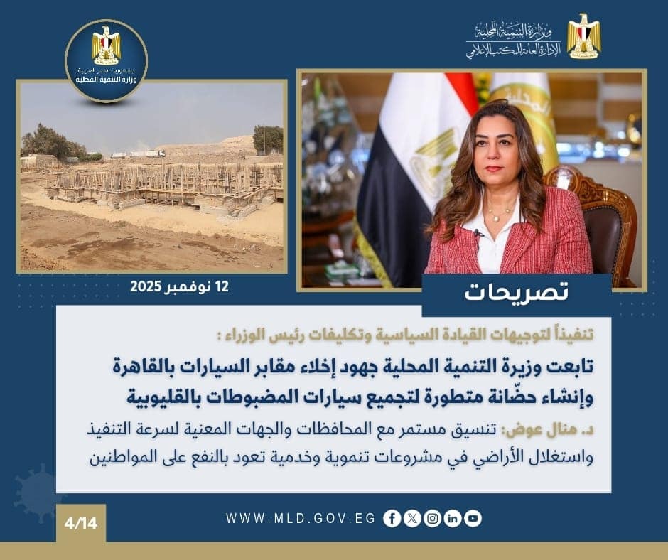 تلقت الدكتورة منال عوض وزيرة التنمية المحلية ، تقريرًا حول جهود الوزارة لتنفيذ تكليفات فخامة السيد رئيس الجمهورية الخاصة بإخلاء مقابر السيارات الواقعة داخل الكتل السكنية والمواقع المتميزة بالمحافظات، واستغلال هذه الأراضي في إقامة مشروعات تنموية وخدمية تعود بالنفع على المواطنين.