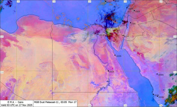 كما تشير أخر صور الأقمار الصناعية إلى تكاثر السحب المنخفضة والمتوسطة على مناطق من السواحل الشمالية الغربية يصاحبها سقوط أمطار خفيفة على مناطق متفرقة من ( الأسكندرية- مطروح )