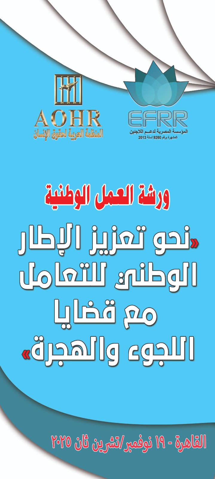تقام غدًا الأربعاء 19 نوفمبر 2025 ورشة عمل وطنية تحت عنوان "نحو تعزيز الإطار الوطني للتعامل مع قضايا اللجوء والهجرة"، وذلك في خطوة استراتيجية لتعزيز الإطار الوطني في هذا الملف، بتنظيم مشترك بين المنظمة العربية لحقوق الإنسان (AOHR) والمؤسسة المصرية لدعم اللاجئين (EFRR).