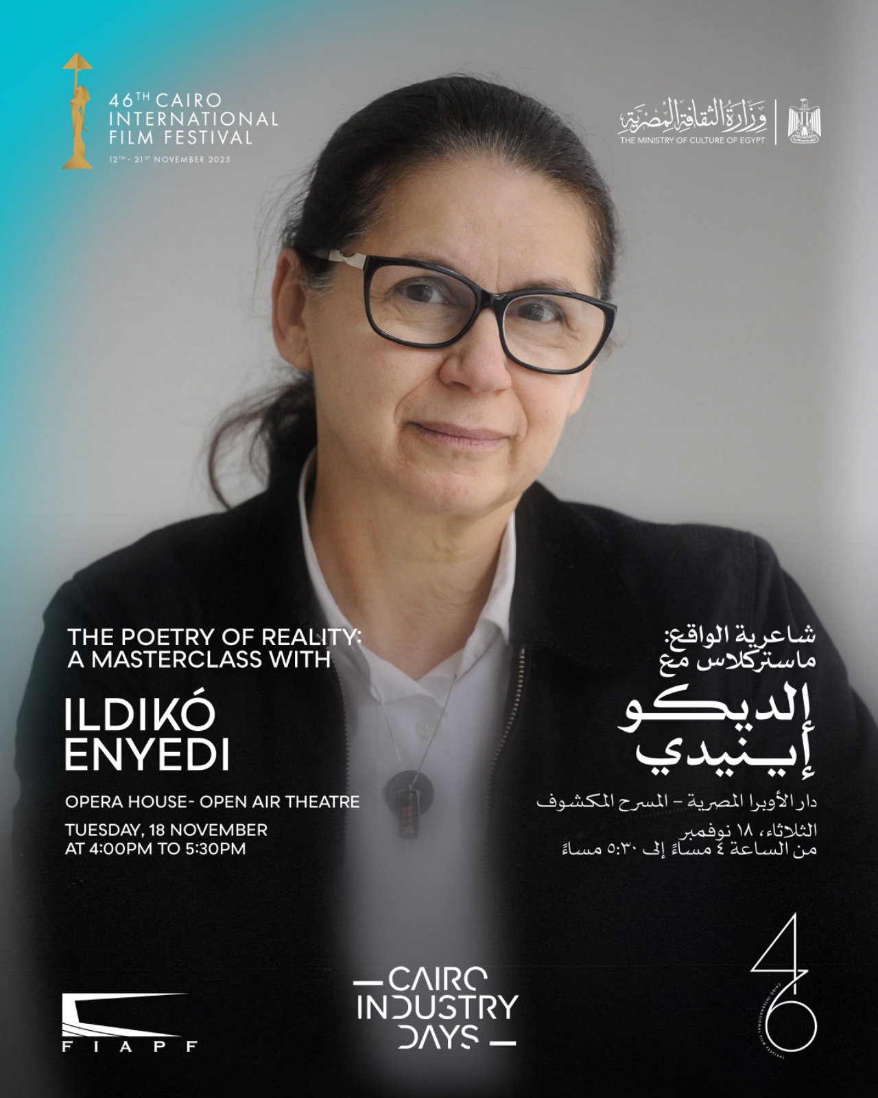 تُقام اليوم الثلاثاء 18 نوفمبر، ضمن فعاليات أيام القاهرة لصناعة السينما بالدورة الـ46 من مهرجان القاهرة السينمائي الدولي، محاضرة خاصة مع إلديكو إينيدي بعنوان "شاعرية الواقع"، وذلك من الساعة 4:00 حتى 5:30 مساءً على المسرح المكشوف بدار الأوبرا المصرية، ويديرها الناقد السينمائي محمد طارق، المدير الفني للمهرجان.