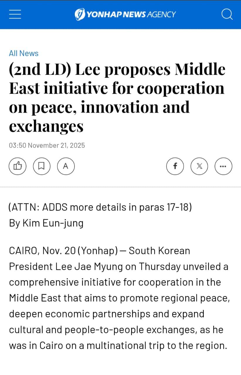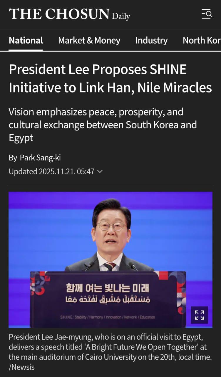 وأوضحت وسائل الإعلام أن حروف مبادرة SHINE ترمز إلى الاستقرار، والانسجام، والابتكار، وبناء الشبكات، والتعليم، في إطار استراتيجية شاملة للتعاون المستقبلي. كما أعلنت صحيفة Maeil Business Newspaper تقديم الرئيس الكوري دعمًا ماليًا بقيمة 10 ملايين دولار للهلال الأحمر المصري، دعماً للجهود الإنسانية في غزة، مع التأكيد على دور كوريا الجنوبية كقوة مسؤولة تدافع عن السلام والتعاون الإقليمي.