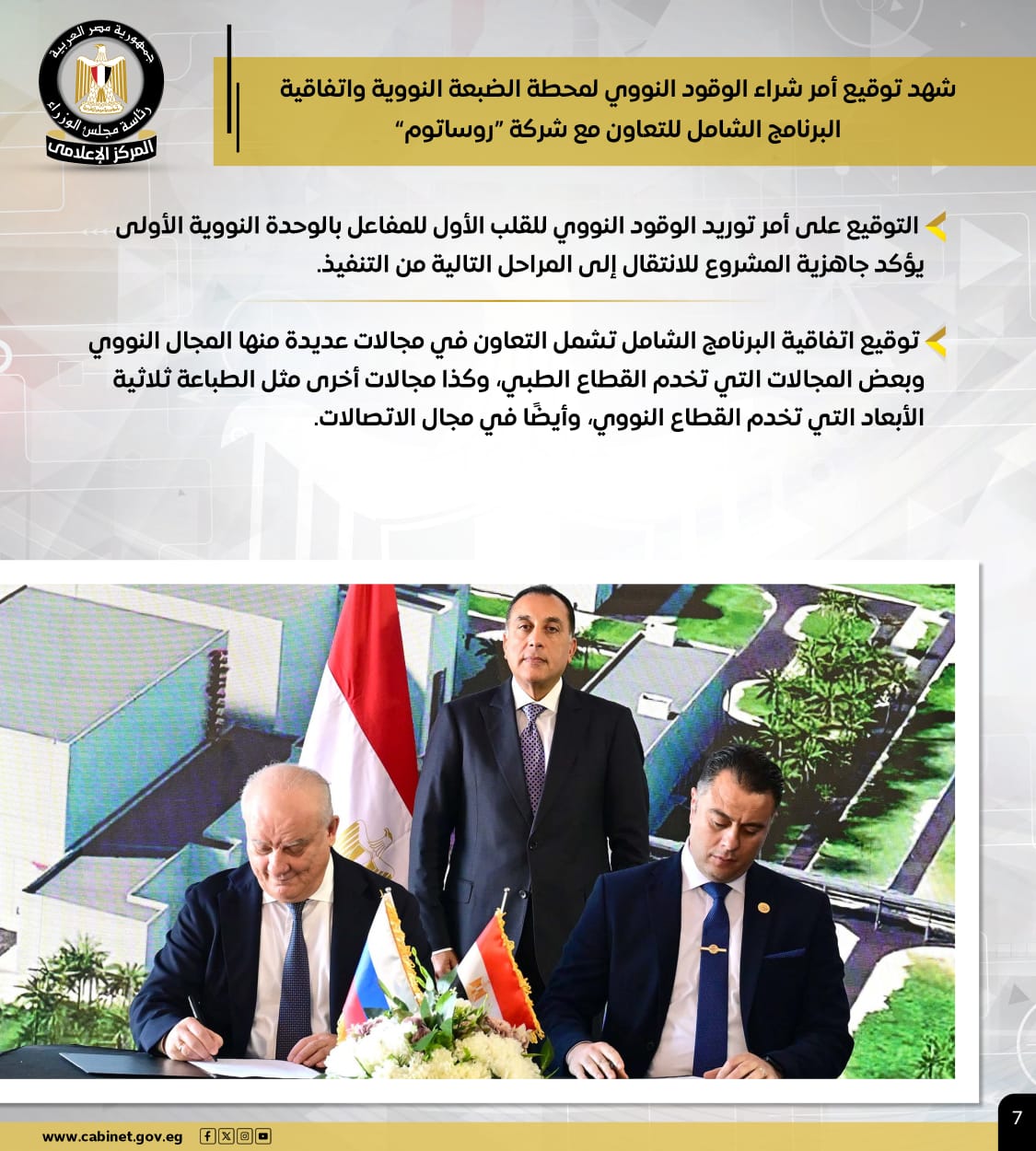 وفي نفس السياق، شهد رئيس الوزراء توقيع أمر شراء الوقود النووي لمحطة الضبعة النووية، بما يؤكد جاهزية المشروع للانتقال إلى المراحل التالية من التنفيذ، كما شهد سيادته توقيع اتفاقية البرنامج الشامل للتعاون مع شركة "روساتوم".