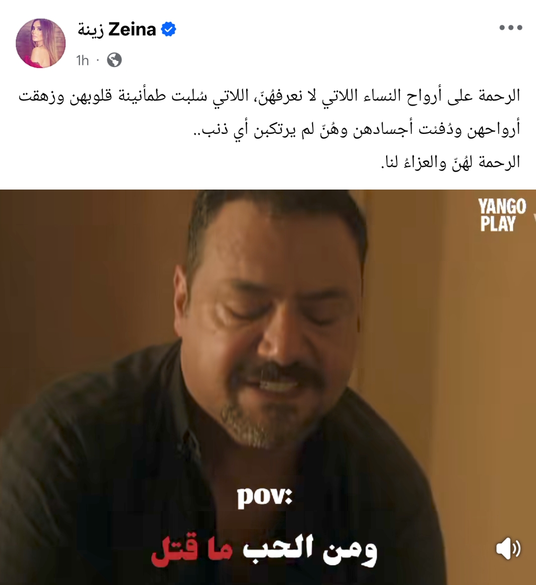 ونشرت زينة مشهد القتل من خلال حسابها الرسمي عبر موقع التواصل الاجتماعي فيسبوك، وعلقت: الرحمة على أرواح النساء اللاتي لا نعرفهُنّ، اللاتي سُلبت طمأنينة قلوبهن وزهقت أرواحهن ودُفىْت أجسادهن وهُنّ لم يرتكبن أي ذنب.. الرحمة لهُنّ والعزاءُ لنا.