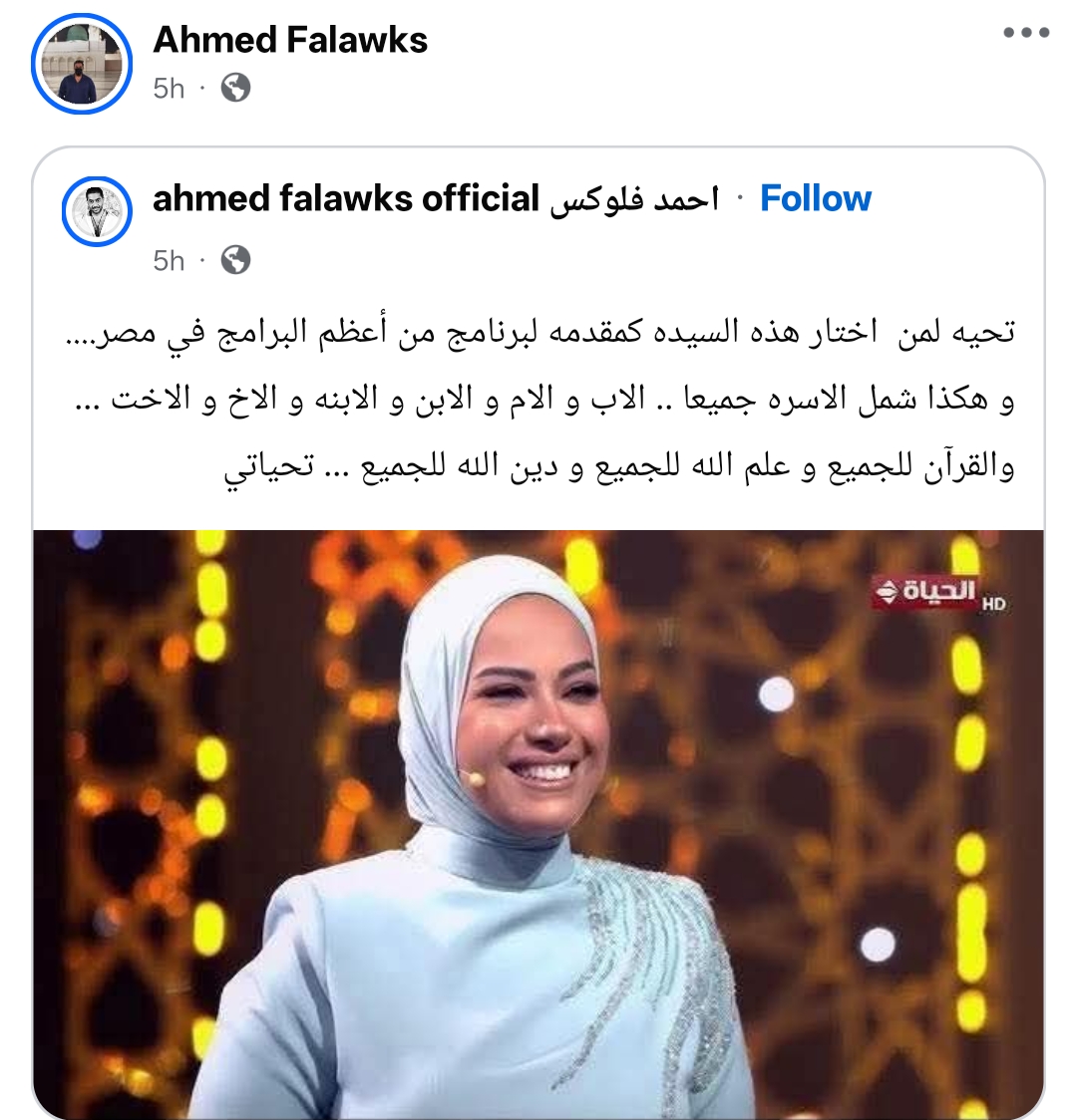 وكتب أحمد فلوكس عبر حسابه بموقع فيسبوك:" تحية لمن اختار هذه السيدة كمقدمة لبرنامج من أعظم البرامج في مصر.. وهكذا شمل الأسره جميعا.. الأب والأم والابن والابنة والأخ والأخت.. والقرآن للجميع وعلم الله للجميع ودين الله للجميع.. تحياتي".