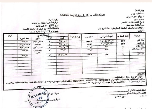 أعلنت وزارة العمل اليوم، عن توفير 275 فرصة عمل جديدة لأبناء محافظة السويس، وذلك للعمل بشركة إيليت سولار العاملة في مجال الصناعات والتقنيات المرتبطة بالطاقة ، وذلك في إطار تنفيذ توجيهات معالي وزير العمل محمد جبران بتوفير فرص عمل لائقة للشباب، وتعزيز فرص التشغيل داخل المشروعات الصناعية