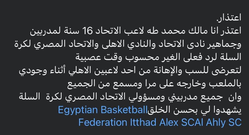 اعتذر انا مالك محمد طه لاعب الاتحاد 16 سنة لمدربين وجماهير نادى الاتحاد والنادي الاهلى والاتحاد المصري لكرة السلة لرد فعلى الغير محسوب وقت عصبية لتعرضى للسب والإهانة من احد لاعبين الاهلي أثناء وجودي بالملعب وخارجه على مرا ومسمع من الجميع