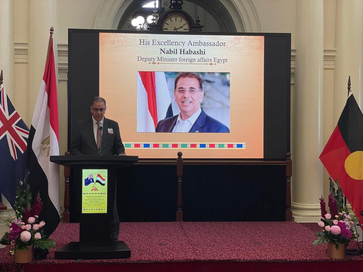 وقد شارك السيد نائب وزير الخارجية فى الاحتفالية الكبرى التى نظمها الاتحاد الأسترالى المصرى (AEF) بمقر برلمان فكتوريا بمناسبة مرور ٧٥ عاماً على تدشين العلاقات الدبلوماسية بين مصر وأستراليا، حيث ثمن ما تشهده العلاقات الثنائية من تطور مستمر فى مختلف المجالات، مبرزا الدور المتنامى للجالية المصرية فى توطيد جسور الصداقة والتعاون بين البلدين.