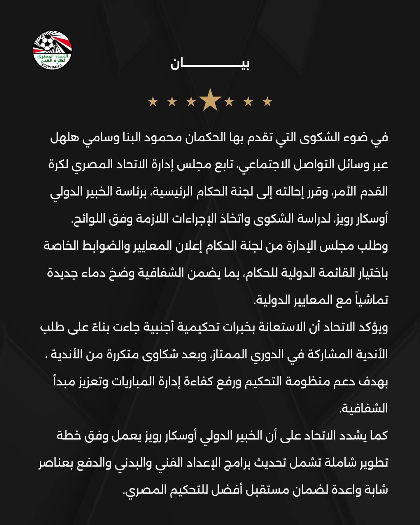 كما يشدد الاتحاد على أن الخبير الدولي أوسكار رويز يعمل وفق خطة تطوير شاملة تشمل تحديث برامج الإعداد الفني والبدني والدفع بعناصر شابة واعدة لضمان مستقبل أفضل للتحكيم المصري.