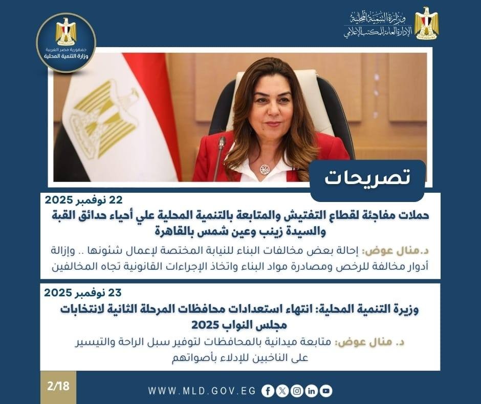 أعلنت الدكتورة منال عوض وزيرة التنمية المحلية، عن قيام لجنة من قطاع التفتيش والرقابة والمتابعة بالوزارة بالمرور المفاجئ خلال شهر نوفمبر الجاري على أحياء السيدة زينب وحدائق القبة وعين شمس بمحافظة القاهرة لمتابعة سير العمل ورفع كفاءة الأداء وضمان الإنضباط الإداري والميداني وتحسين جودة الخدمات المقدمة للمواطنين والحد من البناء المخالف ومراجعة ملفات التصالح والتقنين، المتغيرات المكانية ومتابعة أعمال تنفيذ مشروعات الخطة الاستثمارية والإيرادات والشئون المالية ومنظومة النظافة والحملة الميكانيكية والإشغالات والإعلانات والأسواق وأداء المركز التكنولوجي وحل مشاكل المواطنين .