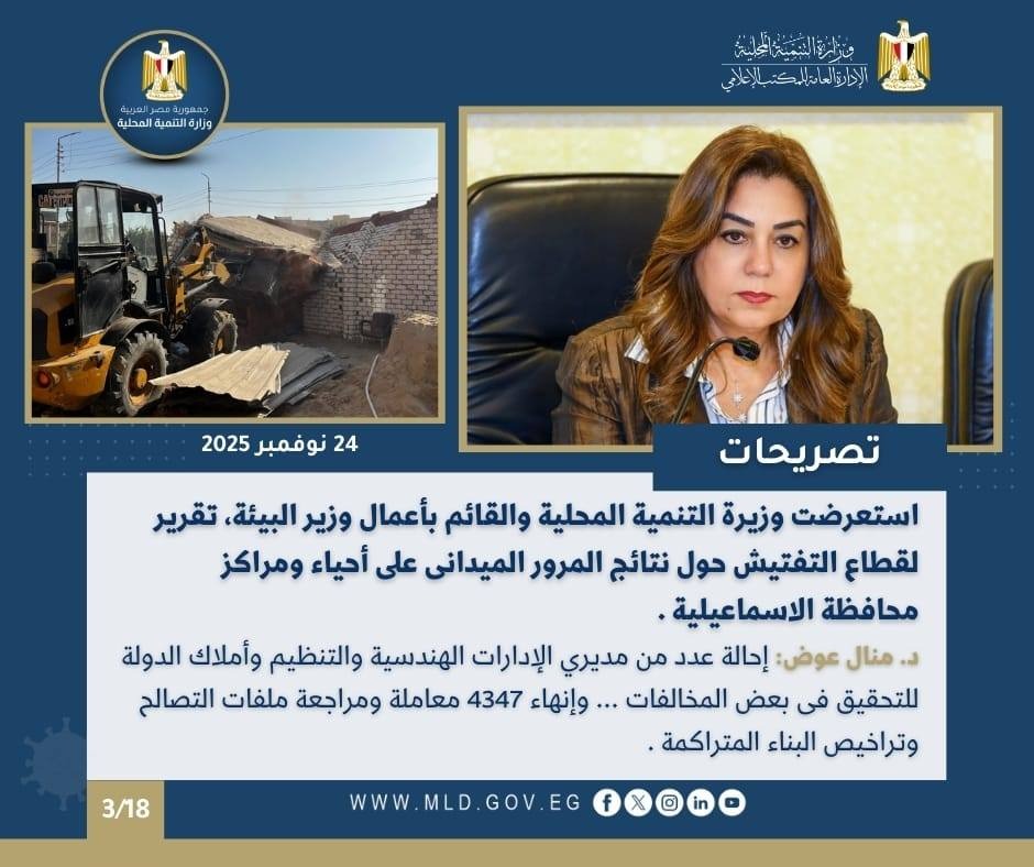 كما استعراضت الدكتورة منال عوض وزيرة التنمية المحلية والقائم بأعمال وزيرة البيئة، تقريراً شاملًا من قطاع التفتيش والمتابعة بالوزارة برئاسة المهندس هيثم الدسوقى حول نتائج المأمورية الميدانية المخططة التي تم تنفيذها خلال شهر نوفمبر الجاري على عدد من المدن والمراكز والأحياء بمحافظة الإسماعيلية، حيث تم متابعة منظومة العمل داخل المراكز التكنولوجي والإدارات الهندسية ومختلف إدارات الأحياء والمراكز والمدن، إلى جانب المرور الميداني لمتابعة حالة الانضباط بالشارع.