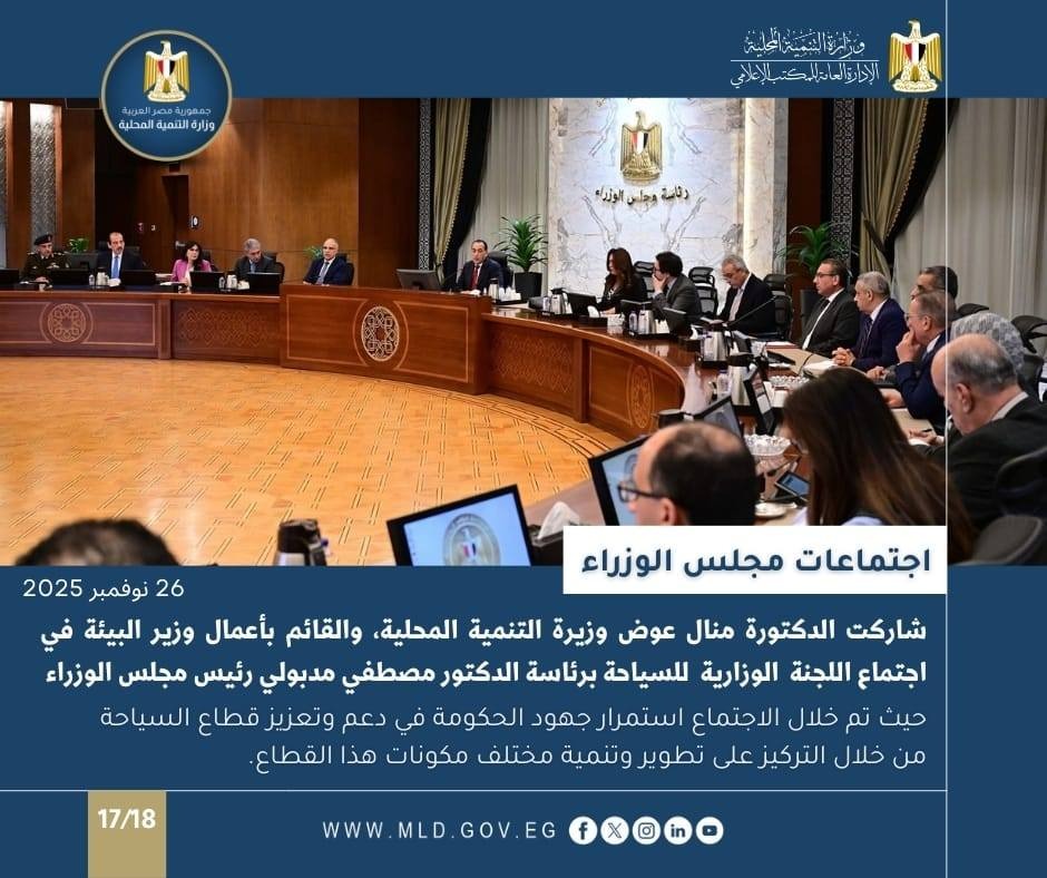 كما شاركت الدكتورة منال عوض وزيرة التنمية المحلية، والقائم بأعمال وزير البيئة في اجتماع اللجنة الوزارية للسياحة برئاسة الدكتور مصطفي مدبولي رئيس مجلس الوزراء، حيث تم خلال الاجتماع استمرار جهود الحكومة في دعم وتعزيز قطاع السياحة من خلال التركيز على تطوير وتنمية مختلف مكونات هذا القطاع.