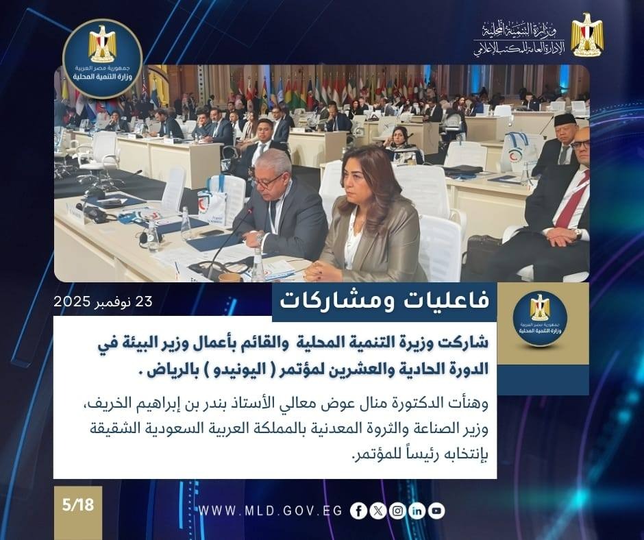 شاركت الدكتورة منال عوض، وزيرة التنمية المحلية والقائم بأعمال وزيرة البئية، في الدورة الحادية والعشرين للمؤتمر العام لمنظمة الامم المتحدة للتنمية الصناعية (اليونيدو)، التي تعقد في الرياض خلال الفترة من ٢٣ إلى ٢٧ نوفمبر ٢٠٢٥.
