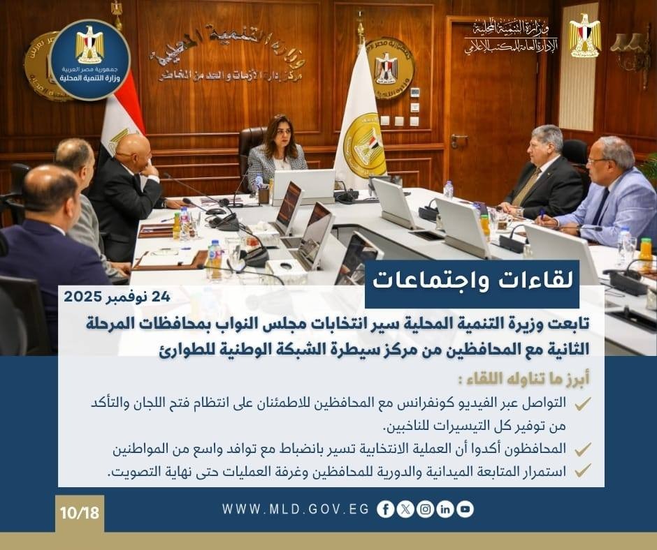 وتابعت الدكتورة منال عوض وزيرة التنمية المحلية والقائم بأعمال وزير البيئة، سير العملية الانتخابية فى اليوم الأول لانتخابات مجلس النواب 2025 بمحافظات المرحلة الثانية والتى تشمل : القاهرة، والقليوبية، والدقهلية، والمنوفية، والغربية، وكفر الشيخ، والشرقية، ودمياط، وبورسعيد، والإسماعيلية، والسويس، وشمال سيناء، وجنوب سيناء، وذلك عبر مركز السيطرة الموحد للشبكة الوطنية للطوارئ والسلامة العامة بالديوان العام للوزارة بالعاصمة الجديدة.