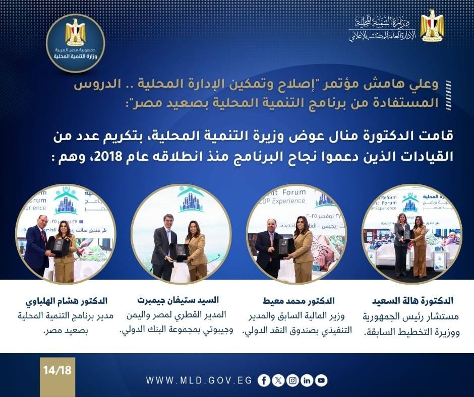 وتطلق وزارة التنمية المحلية أعمال المؤتمر الوطني رفيع المستوى بعنوان "إصلاح وتمكين الإدارة المحلية: الدروس المستفادة من برنامج التنمية المحلية بصعيد مصر"، صباح غداً الخميس 27 نوفمبر 2025 والذي تنظمه وزارة التنمية المحلية بالشراكة مع عدد من الوزارات ، وبالتعاون مع مجموعة البنك الدولي وذلك تحت رعاية وحضور الدكتور مصطفي مدبولي رئيس مجلس الوزراء.