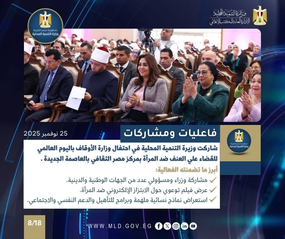 كما شاركت الدكتورة منال عوض وزيرة التنمية المحلية والقائم بأعمال وزير البيئة، في احتفال وزارة الأوقاف باليوم العالمي للقضاء علي العنف ضد المرأة بمركز مصر الثقافي الإسلامي بالعاصمة الجديدة وذلك بالتعاون مع المجلس القومي للمرأة.