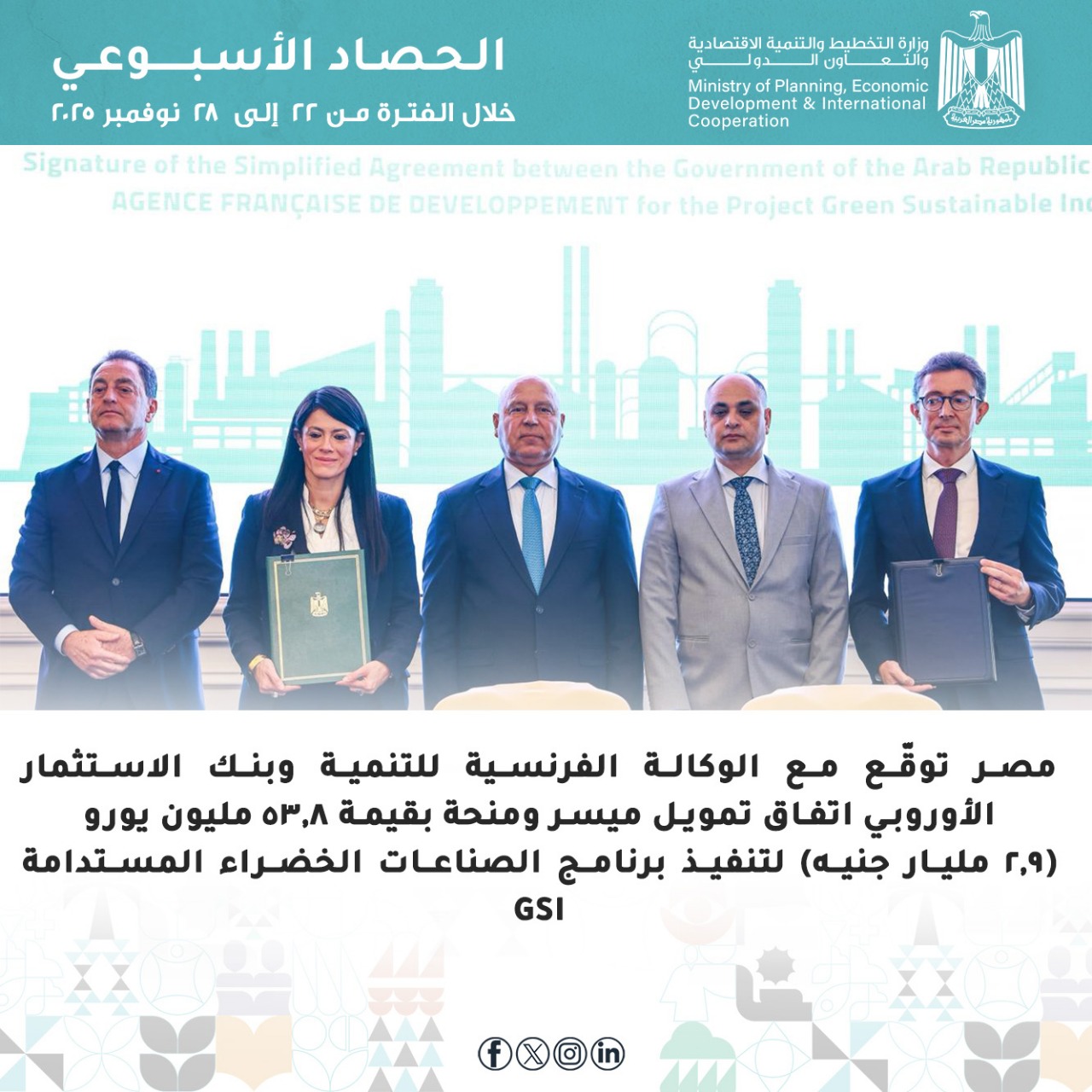 وفي سياق آخر، شهد الأسبوع المنقضي، توقيع وزارة التخطيط والتنمية الاقتصادية والتعاون الدولي، ووزارة البيئة، اتفاق تمويل ميسر ومنحة مع الوكالة الفرنسية للتنمية، وبنك الاستثمار الأوروبي، بقيمة 53.8 مليون يورو (2.9 مليار جنيه) غي إطار جهود تنفيذ برنامج الصناعات الخضراء المستدامة GSI، لدعم التحول الأخضر بقطاع الصناعة وخفض الانبعاثات وتعزيز تنافسية القطاع، وذلك خلال الفعالية رفيعة المستوى التي نظمتها الوزارتان لتعريف القطاع الخاص وممثلي قطاع الصناعة ببرنامج الصناعات الخضراء المستدامة لدعم الصناعة المصرية، وبمشاركة ممثلي المؤسسات الدولية، وممثلي البنك الأهلي المصري.