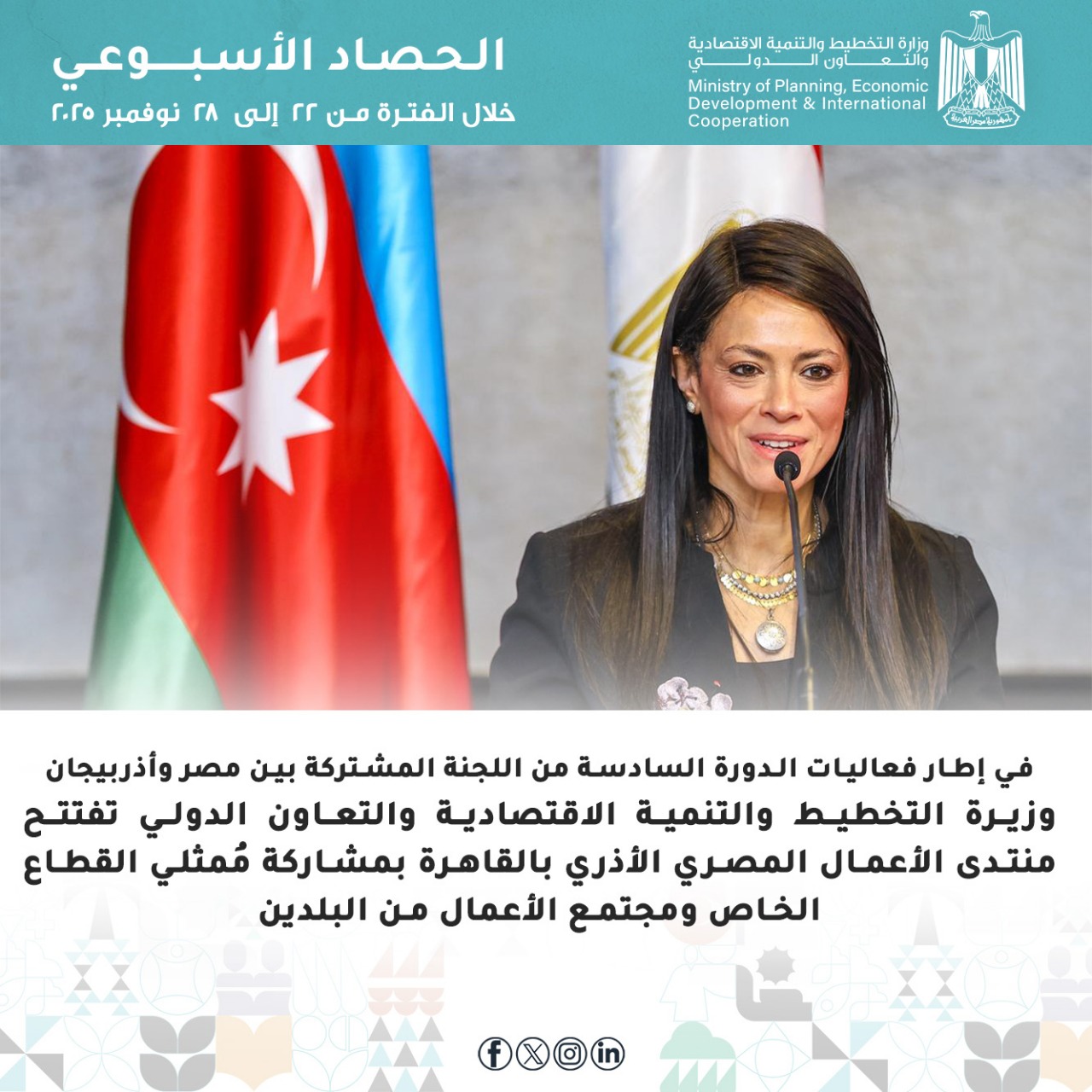 وتضمنت فعاليات الأسبوع ، انعقاد الدورة السادسة من اللجنة المشتركة المصرية الأذرية للتعاون الاقتصادي والعلمي والفني، بالقاهرة، برئاسة الدكتورة رانيا المشاط، وزيرة التخطيط والتنمية الاقتصادية والتعاون الدولي، والسيد/ رشاد نباييف، وزير التنمية الرقمية والنقل الأذري، وبمشاركة ممثلي الجهات الحكومية من الجانبين، كما انعقد في إطار اللجنة منتدى الأعمال المشترك بمشاركة القطاع الخاص والمستثمرين من مصر وأذربيجان، وعقد الجانبان أيضا جلسة مباحثات ثنائية لبحث سبل تعزيز التعاون المشترك.