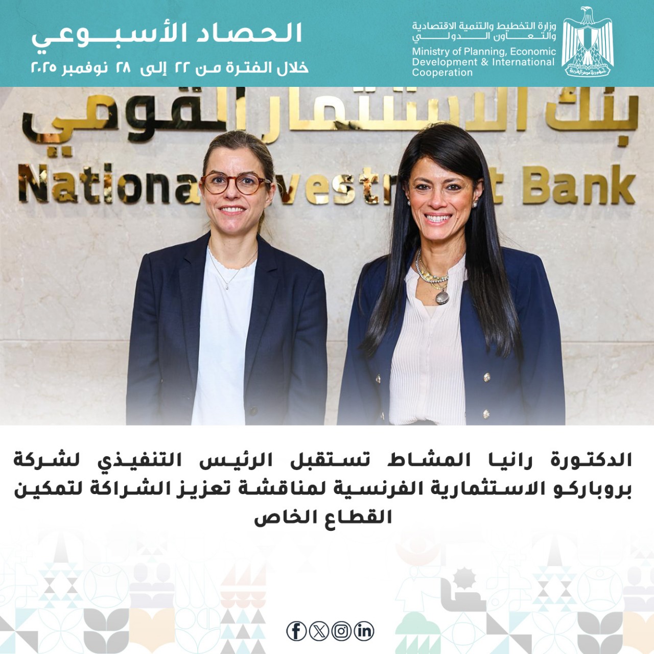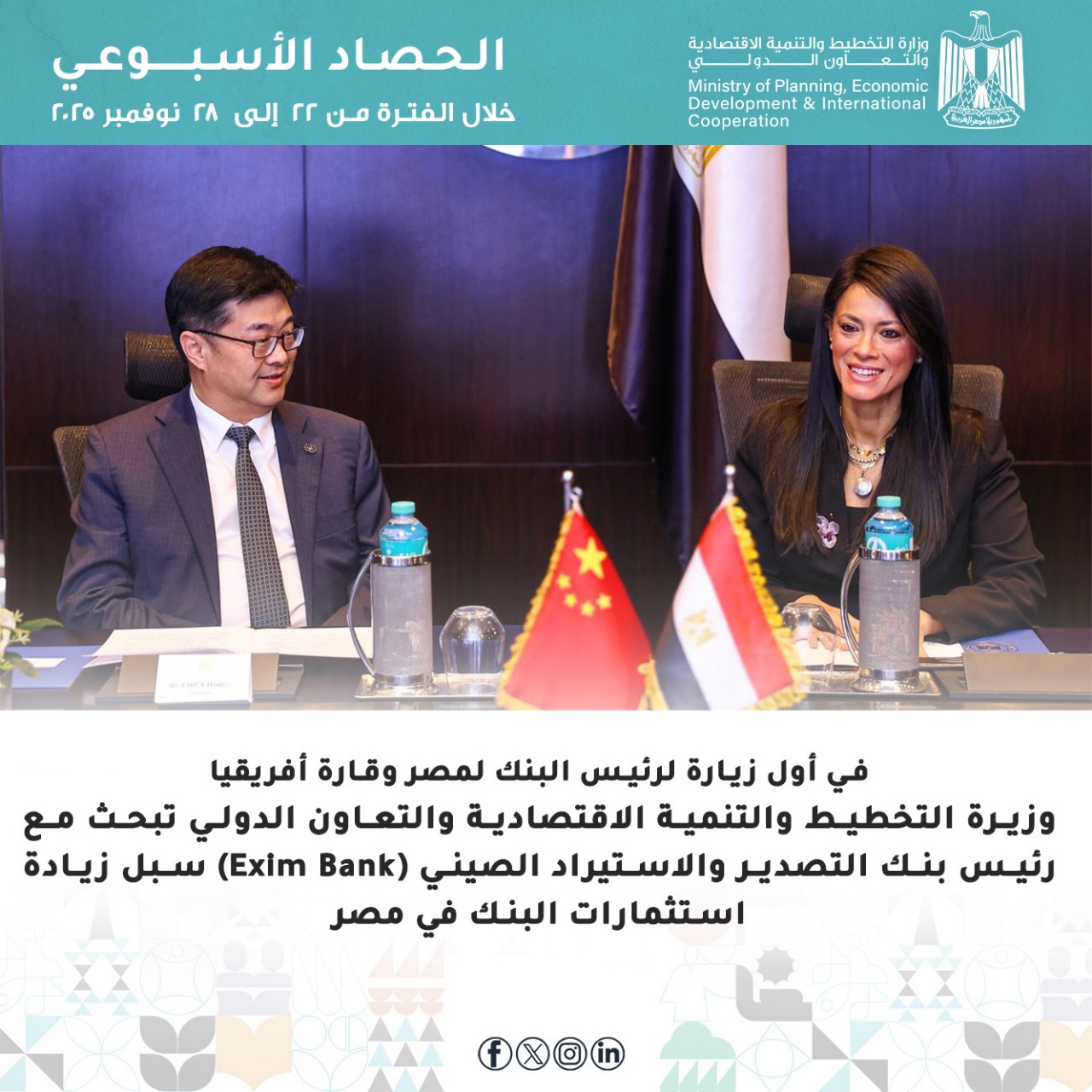 كما تضمنت فعاليات الأسبوع، استقبال الدكتورة رانيا المشاط السيدة فرانسواز لومبار، الرئيس التنفيذي لشركة بروباركو الاستثمارية، التابعة للوكالة الفرنسية للتنمية، لمناقشة تعزيز سبل التعاون المشترك لتمكين القطاع الخاص من خلال الخدمات التمويلية والاستثمارية، واستقبلت أيضا السيد/ تشن هوايو، رئيس بنك التصدير والاستيراد الصيني (Exim Bank)، الذي قام بزيارة مصر وقارة أفريقيا لأول مرة، حيث عقد الجانبان جلسة مباحثات لمناقشة جهود التعاون المشترك في إطار العلاقات رفيعة المستوى والشركة الاستراتيجية الشاملة بين جمهورية مصر العربية وجمهورية الصين الشعبية.