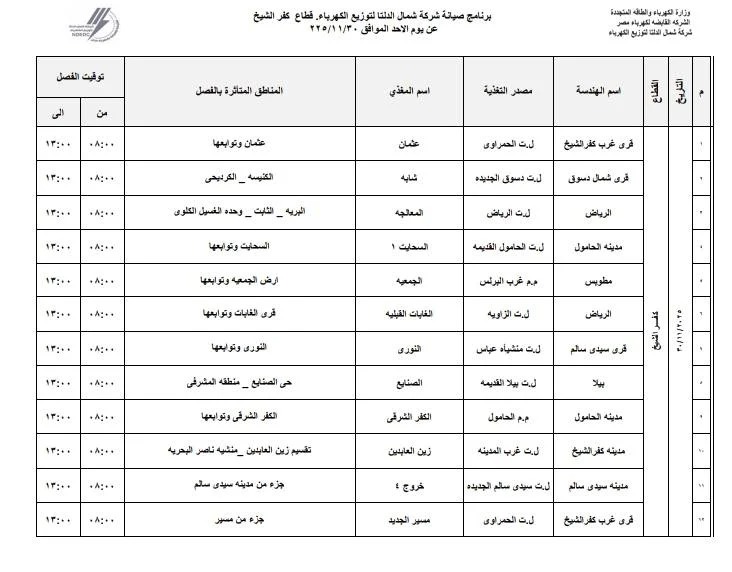 أعلنت شركة شمال الدلتا لتوزيع الكهرباء، عن انقطاع التيار الكهربائي، عن 17 قرية وتوابعهم ومنطقة ب 8 مراكز بمحافظة كفر الشيخ، غداُ الأحد، 30 نوفمبر 2025م، انقطاع التيار الكهربائي، وذلك في إطار خطة شركة شمال الدلتا لتوزيع الكهرباء، للصيانة الدورية لرفع كفاءة الشبكة وتحسين جودة التغذية الكهربائية والخدمة المقدمة للمواطنين.