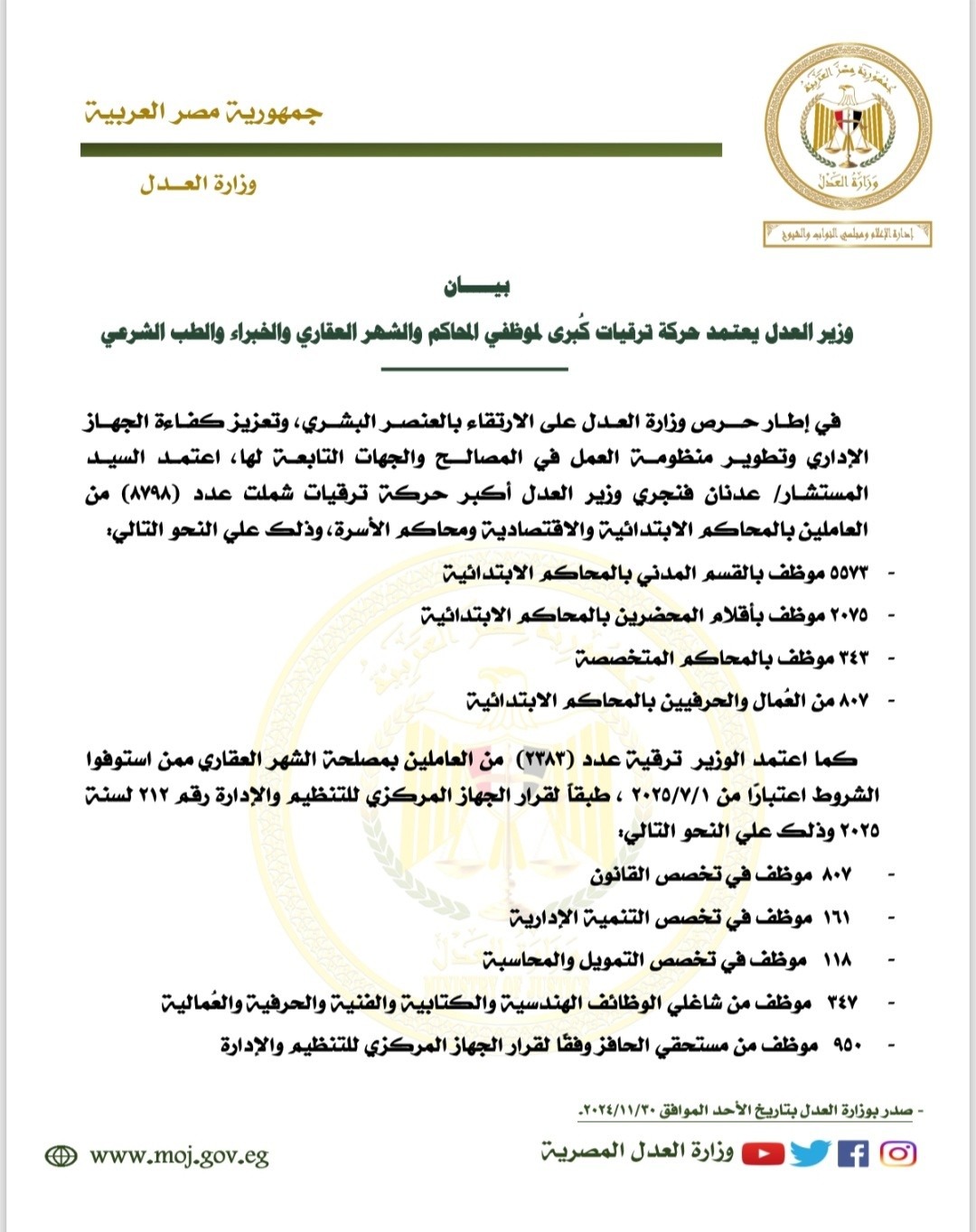 في إطــار حــــرص وزارة العــدل على الارتقاء بالعنصــر البشـــري، وتعزيز كفــاءة الجهـــاز الإداري وتطويــر منظومـــة العمل في المصالــــح والجهات التابعــة لها، اعتمــد السيــد المستشــار عدنان فنجري وزير العدل أكبر حركة ترقيات شملت عدد (8798) من العاملين بالمحاكم الابتدائية والاقتصادية ومحاكم الأسرة، وذلك علي النحو التالي: