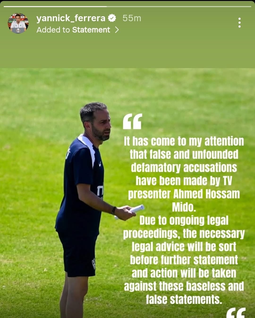 وقال فيريرا، في بيان نشره عبر حسابه الرسمي على "إنستجرام": "لقد علمت أن مقدم البرامج أحمد حسام ميدو قد أدلى باتهامات تشهيرية لا أساس لها من الصحة ، وبسبب الإجراءات القانونية الجارية، سيتم اتخاذ الخطوات القانونية اللازمة ضد هذه الادعاءات الكاذبة قبل إصدار أي بيان إضافي."