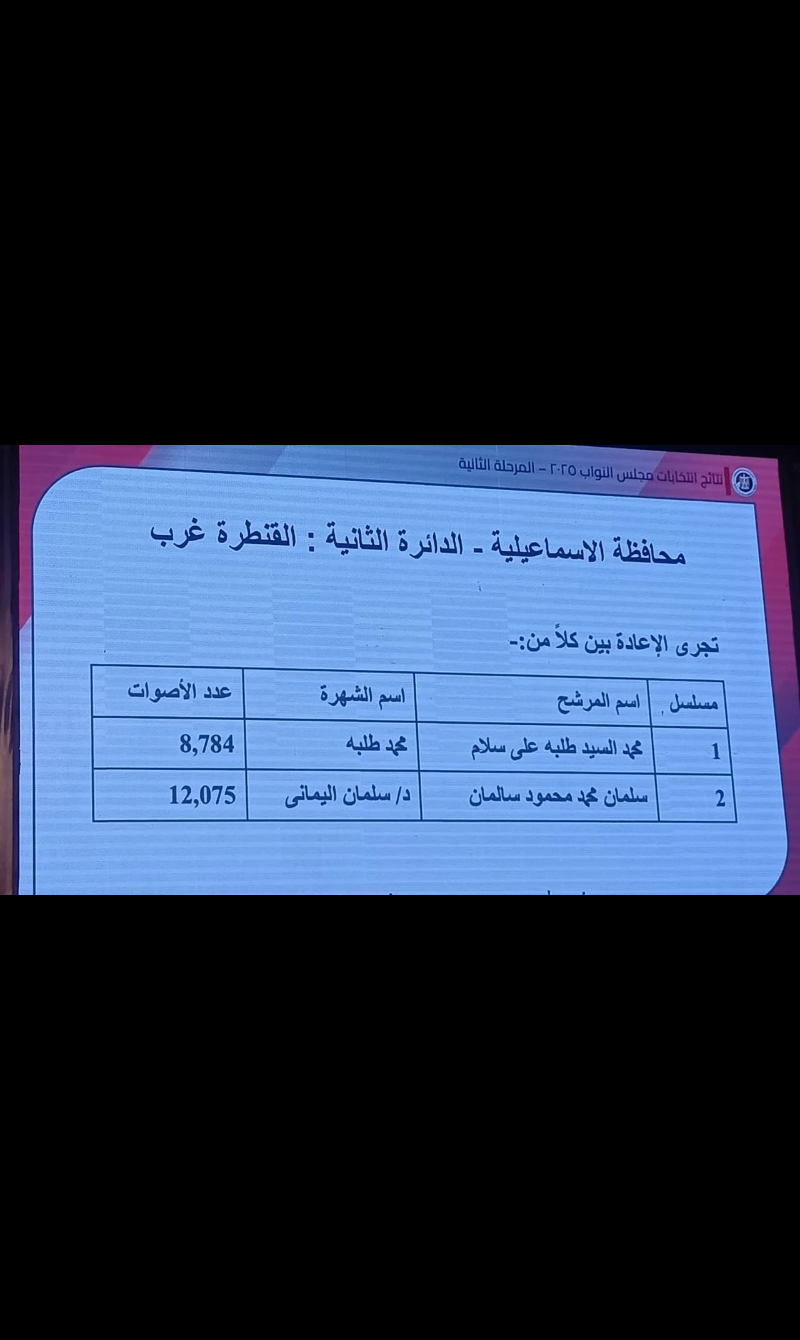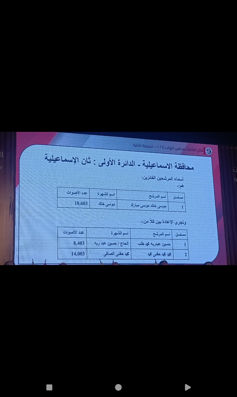 في محافظة الإسماعيلية، جرت إعادات قوية في معظم المقاعد الفردية، بينما حسم حزب مستقبل وطن المقعد الأول في إحدى الدوائر.