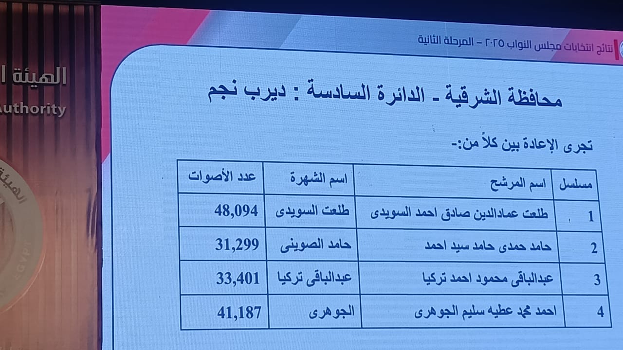 أعلنت الهيئة الوطنية للانتخابات، برئاسة القاضي حازم بدوي، النتائج الرسمية للجولة الأولى من المرحلة الثانية لانتخابات مجلس النواب 2025، والتي تشمل دوائر محافظة الشرقية.