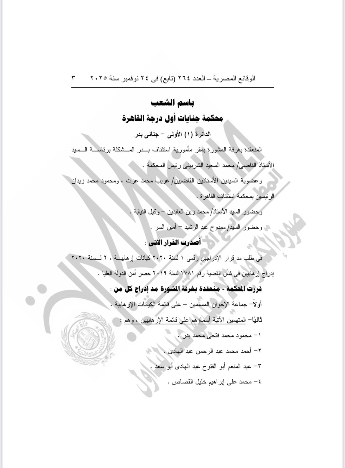 نشرت الجريدة الرسمية قرار محكمة الجنايات بالقاهرة المنعقدة ببدر بإدراج جماعة الاخوان منظمة إراهابية.
