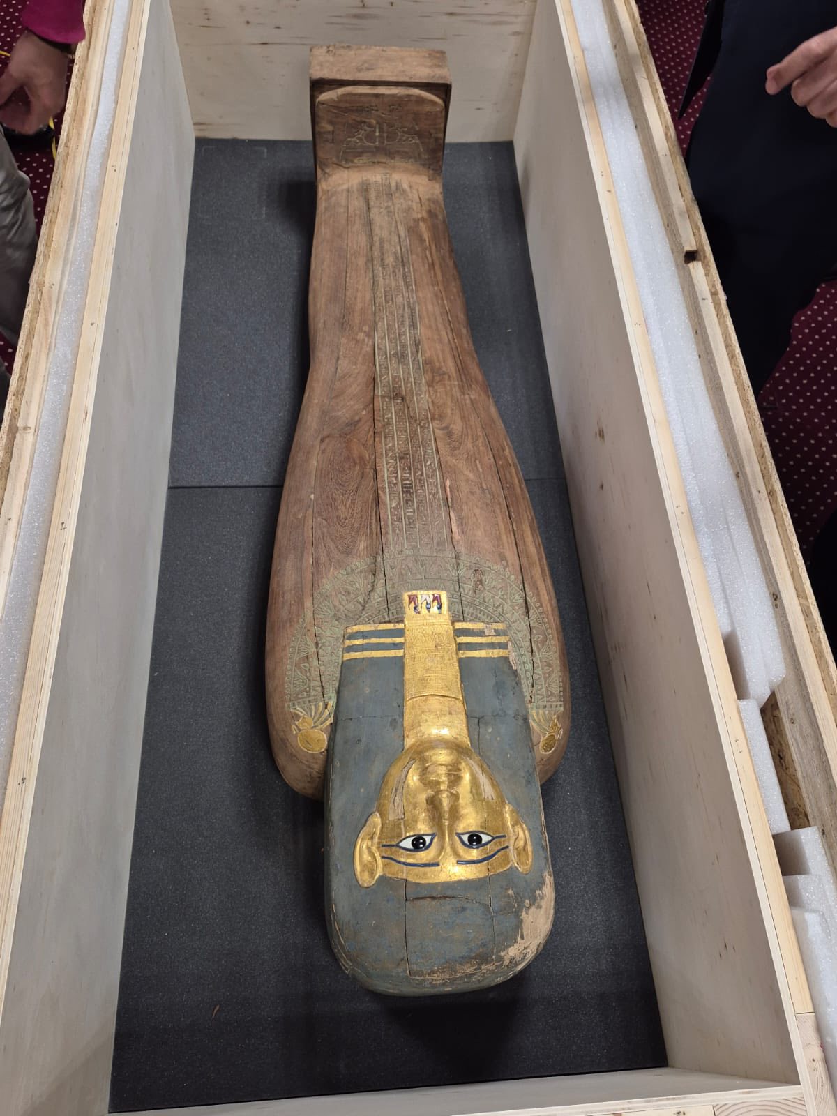 وأشار الاستاذ شعبان عبد الجواد مدير عام الادارة العامة للآثار المستردة والمشرف على الإدارة المركزية للمنافذ الأثرية بالمجلس الأعلى للآثار، الى ان القطع الأثرية المستردة عبارة عن تابوت خشبي مطلي ومذهب من العصر المتأخر، ويتميز بزخارفه الدقيقة التي تعكس الطقوس الجنائزية وتقنيات صناعة التوابيت في ذلك العصر، بالإضافة إلى لحية خشبية أثرية كانت جزءًا من تمثال مصري قديم، من عصر الدولة الوسطى، وتمثل نموذجًا لأحد العناصر الرمزية المهمة في فن النحت المصري القديم.