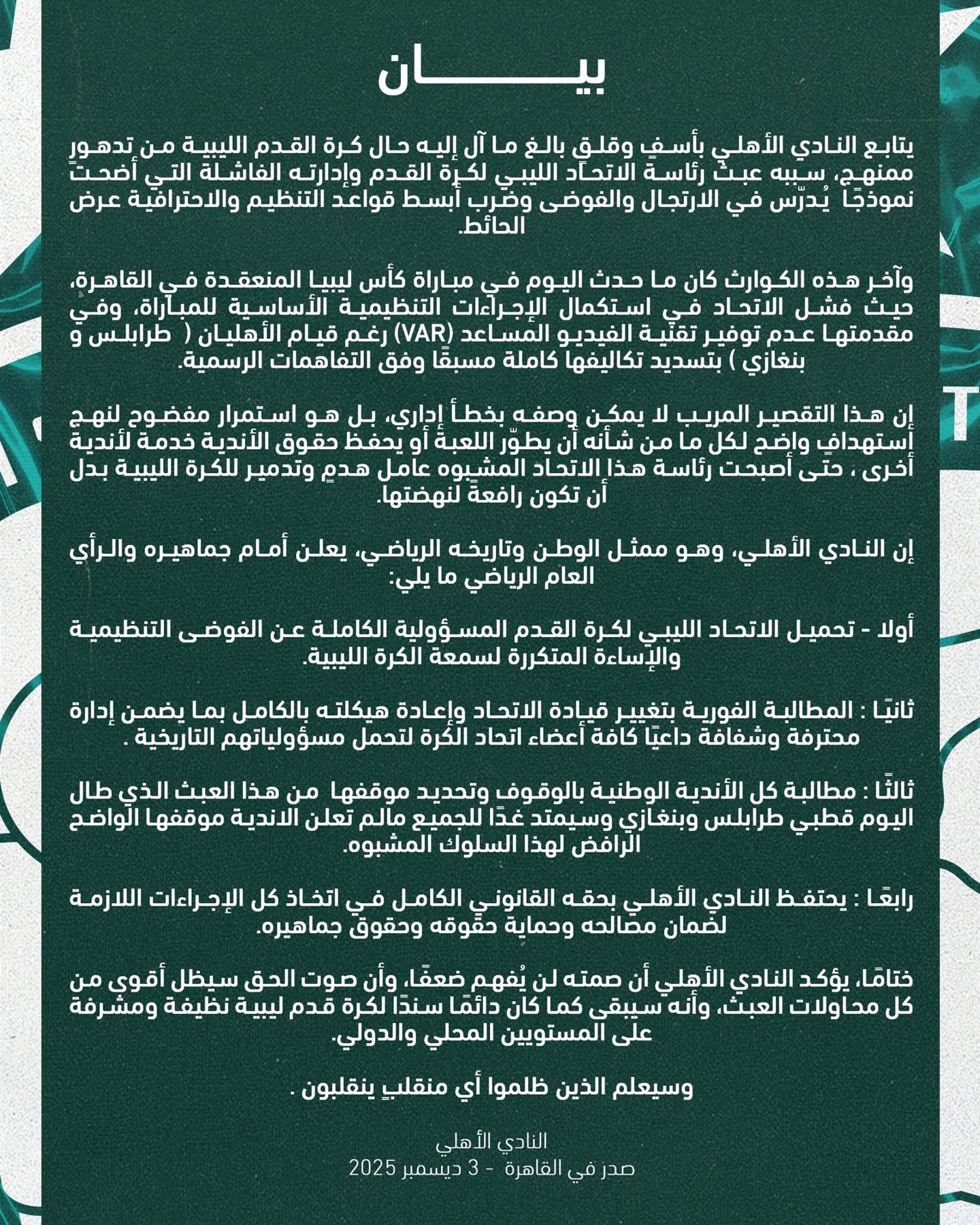 يتابع النادي الأهلي بأسف وقلق بالغ ما آل إليه حال كرة القدم الليبية من تدهور ممنهج، سببه عبث رئاسة الاتحاد الليبي لكرة القدم وإدارته الفاشلة التي أضحت نموذجا يدرس في الارتجال والفوضى وضرب أبسط قواعد التنظيم والاحترافية عرض الحائط.
